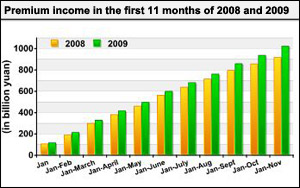 Premium of China's insurance companies hit 1.02 trillion yuan ($149.6 billion) in the first 11 months of this year, up 11.65 percent from a year earlier.