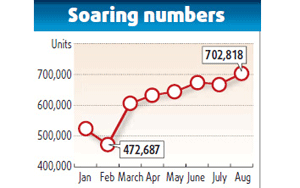 Domestic passenger vehicle sales hit a new record high in August, nearly doubling over last year, far beyond industry expectations.
