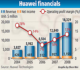 Chinese telecom equipment maker Huawei Technologies said yesterday its net profit jumped 20 percent in 2008, driven by strong overseas sales in emerging markets and improved profit margins.