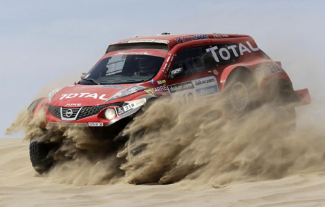 China's Yong Zhou and co-pilot France's Pascal Maimon pose in their Great Wall car while holding a Chinese flag on the podium during the departure ceremony of the fifth South American edition of the Dakar Rally 2013 in Lima Jan 5, 2013.