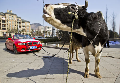 A cow drags a red BMW in Qingdao, Shandong province, Feb 19, 2013. Li Liangkui spent 1,000 yuan to hire the cow to stage a protest after a repair shop repeatedly failed to fix his car since October.[Photo/ asianewsphoto]