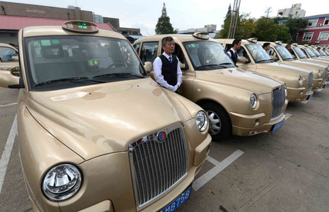 The first 50 of 200 Britain's old-fashioned taxi cars line up in Shanghai, Oct 11, 2014. These special cars featuring barrier-free designs have been introduced with the main purpose to provide services to those who have special needs, such as the disabled and the seniors.