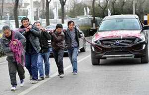 A Volvo SUV, pulled by five men with a rope, set off from the front gate of a car outlet and was paraded in Northwest China's Shaanxi province.