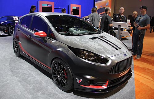 A modified 2014 Ford Fiesta ST named Forza 5 by MRT Performance is displayed at the SEMA Show taking place from Sunday to Friday at the Las Vegas Convention Center in the United States.