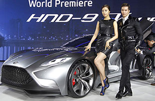 Models pose next to Hyundai Motor's luxury sports coupe concept "HND-9" at the Seoul auto show in Goyang, north of Seoul March 28.