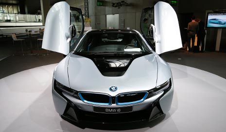 The BMW i8 plug-in hybrid sports car is pictured before the official delivery to the first customer in Munich June 5, 2014.