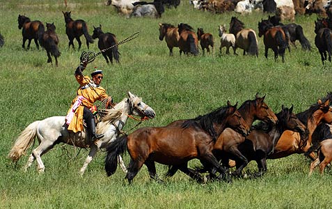 A rider takes part in a lassoing exhibition competition during the Nadam festival at a race ground on Bayanbulak prairie in northwest China's Xinjiang Uygur autonomous region, July 17, 2011.