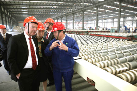 Corporation, listens to a worker at the Zhejiang Glass Co Ltd. The CEO of the