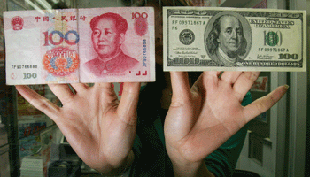 staff shows a Chinese 100 yuan banknote (L) and a US$100 banknote in Hong