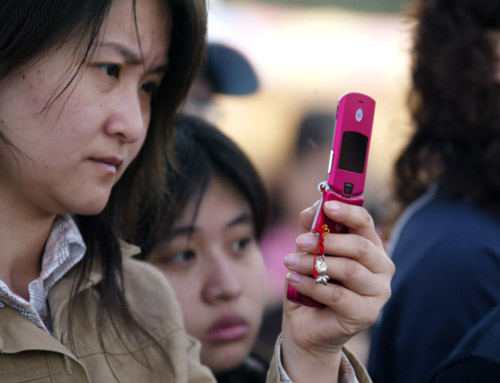 A woman reads her text message on a street in Beijing, in this May 2006 file photo. [newsphoto]