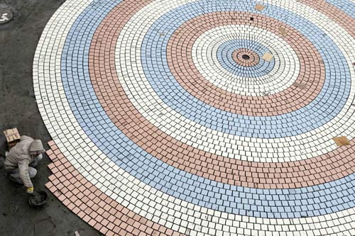 A labourer works on ground tiles outside a stadium in Shanghai January 16, 2007. China's exhibition industry will continue its rapid growth as the sector is further regulated, especially in the area of intellectual property rights (IPR), according to a report released on Monday. According to the annual report on China's exhibition industry compiled by the China Council for the Promotion of International Trade (CCPIT), the country hosted more than 3,800 trade fairs last year, which raised 14 billion yuan from direct sales. [Reuters]