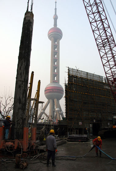 Labourers work at a construction site in the Pudong New Area in Shanghai, January 17, 2007. Shares of Chinese property developers plunged yesterday in reaction to a government announcement that it would begin collecting land appreciation tax from next month. [newsphoto]