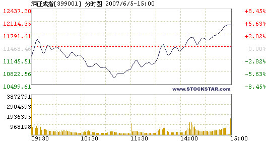At the Shanghai bourse, 423 stocks saw their prices rise, 359 fell and 57 ended flat. Jilin Forest Industry rose 10.05 percent to 10.07 yuan as the biggest gainer. Tangshan Sanyou Chemical Industries and Zhejiang Feida Environmental Science and Technology were also sealed at the maximum cap of 10 percent. Zhejiang King Refrigeration Industry, however, was the biggest loser today with a 10.04 percent drop. The Shenzhen Component Index, tracking the smaller Shenzhen Stock Exchange, had a similar mapping with the Shanghai index. It opened lower from 10,933.22, but closed on the peak of the daily movement at 12,017.71, up 549.25 points or 4.97 percent, after hitting a bottom at 10,652.19 in the morning. Shenzhen Component Index