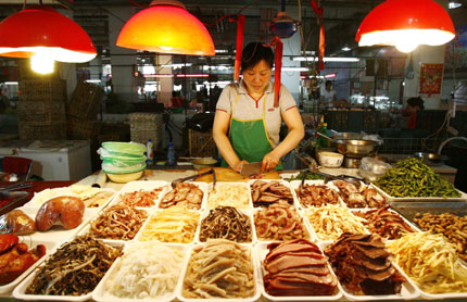 A vendor sells cooked food at a market in Shenyang, northeast