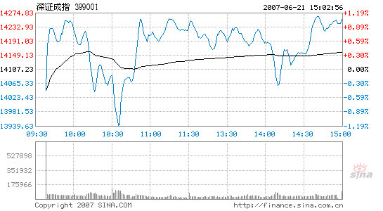 Stocks up with lowest turnover this week, 06/21By Li Zengxin (chinadaily.com.cn)Updated: 2007-06-21 15:52 Chinese stocks fluctuated violently today but managed to return to a higher level. The Shanghai Composite Index closed at 4,230.82, up 49.5 points or 1.18 percent from yesterday's closing. Total turnover of the stocks enclosed by the major indices was 247.6 billion yuan, the lowest this week. Opening lower from 4,170.89, the benchmark index rose sharply to the first peak after it started, but soon dived to the lowest 4,147.05. Then it hiked in waves to the second but higher peak at 4,256.54. But from there it plunged again, hit the bottom around the mid-point of the afternoon session, and then edged up to the close. Shanghai Composite