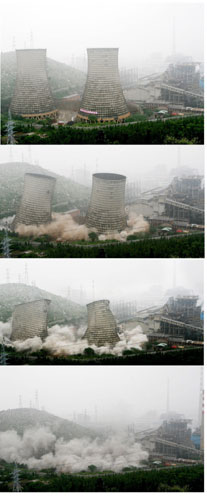 A combo pictures shows two cooling towers are demolished in Huaibei, East China's Anhui Province June 22, 2007. The province takes concrete steps to cut resource consumption and obtain energy conservation. [Xinhua]