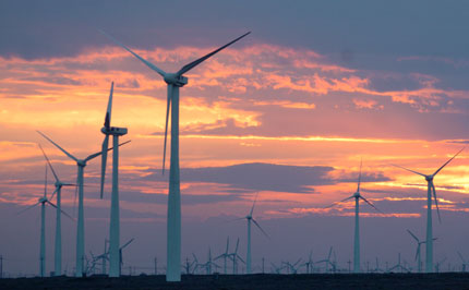 Wind power mills are pictured in the sunset in Turpan, Xinjiang Uygur Autonomous Region July 10, 2007. [Xinhua]