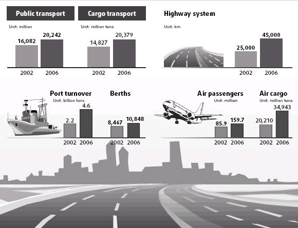 Expressway and highway systems have also been enhanced in recent years. By the end of 2006, the country had 45,000km of expressways in service, an increase of 80.4 percent from 2002.
