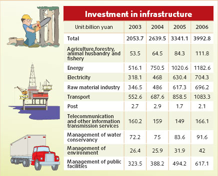 From 2003 to 2006, China made a total fixed-assets investment of 12.03 trillion yuan (US$1.61 trillion) in basic industries and infrastructure sectors, such as agriculture, energy, transport, telecom and public facilities, the NBS report said.