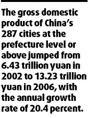 The gross domestic product (GDP) of the 287 cities jumped from 6.43 trillion yuan in 2002 to 13.23 trillion yuan in 2006, with the annual growth rate of 20.4 percent. The proportion of the country's overall GDP increased from 53.4 percent in 2002 to 63.2 percent in 2006.