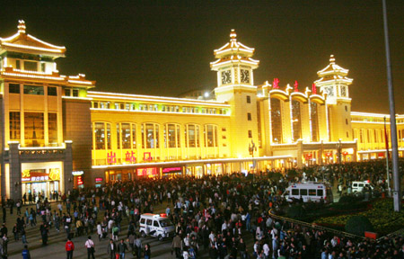 Tens of thousands of people crowd at the Beijing Railway Station, September 30, 2007. China's National Day, which falls on October 1, was first officially prolonged to a week-long holiday in 1999. Many people choose to travel across the country during the seven-day National Day holiday. The capital's tourism administration bureau has predicted that about 1.7 million people will visit the capital during the seven-day holiday. [newsphoto]