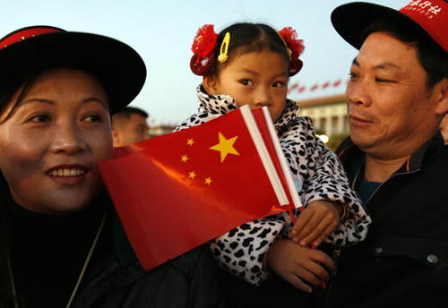 A family watches the flag-raising ceremony at the Tiananmen Square across from the Great Hall of the People, the venue of 17th National Congress of the Communist Party of China, in Beijing, October 15, 2007. [Reuters]