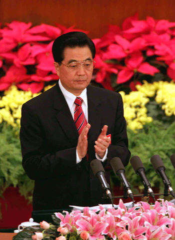 Chinese President Hu Jintao, also general secretary of the Communist Party of China (CPC), gives a keynote speech at the opening of the 17th National Congress of the CPC in Beijing to map out China's all-round development for the coming five years, October 15, 2007. [newsphoto]