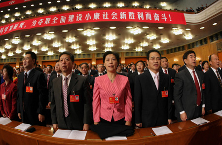 Delegates of the 17th National Congress of the Communist Party of China (CPC) sing Chinese national anthem on the opening of the conference at the Great Hall of the People in Beijing on Monday, October 15, 2007. [Xinhua]