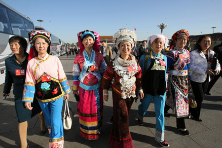 Delegates of the 17th National Congress of the Communist Party of China (CPC) walk into the Great Hall of the People where the conference is held in Beijing on Monday, October 15, 2007. [Xinhua]