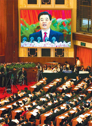 | A live image of Party General Secretary Hu Jintao is seen on a giant screen inside the Great Hall of the People at the opening of the 17th National Congress of the Communist Party of China. Hu's keynote report was broadcast live yesterday morning on TV, radio and the Internet.[AP] |