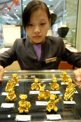 A saleswoman presents a set of gold statues featuring animals of the Chinese zodiac in a department store in Lianyungang, East China's Jiangsu Province on October 15, 2007. October is the peak season for selling gold ornaments. [newsphoto]