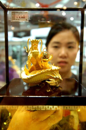 A saleswoman looks at a dragon statue made of gold in a department store in Lianyungang, East China's Jiangsu Province on October 15, 2007. October is the peak season for selling golden ornaments. [newsphoto]