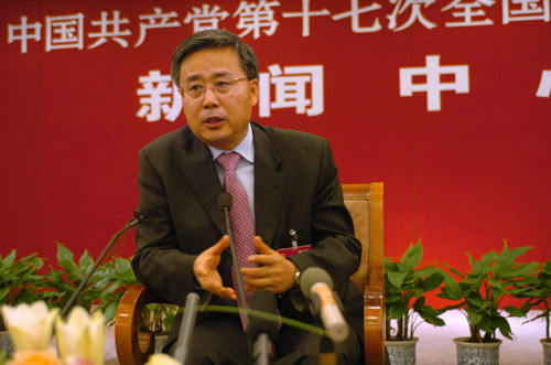 Guo Shuqing, chairman of China Construction Bank, gestures at a press conference at the ongoing CPC congress. Guo said the government should try every means possible to offer easy access to finance for migrant workers in cities."There is a high number of people that our policies have ignored and that should be the government's first priority to offer adequate services," said Guo. "Their future is vital for social harmony." [Xinhua]