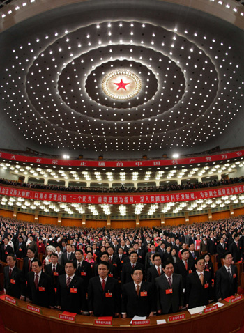 Delegates of the 17th National Congress of the Communist Party of China attend the closing session of the congress in Beijing October 21, 2007. The conference elected a new central leadership for the Party and endorsed a political declaration to chart the country's development. [Xinhua]