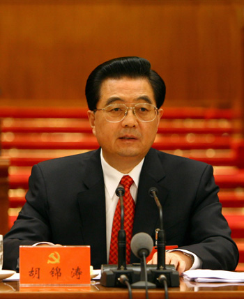 Chinese President Hu Jintao, also general secretary of the Central Committee of the Communist Party of China, presides over the closing session of the 17th National Congress of the Communist Party of China in Beijing October 21, 2007. The conference elected a new central leadership for the Party and endorsed a political declaration to chart the country's development. [Xinhua]