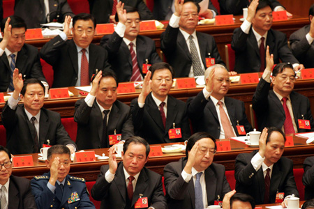 Delegates raise their hands to cast votes for a resolution on the Central Commission for Discipline Inspection's work report at the Great Hall of the People in Beijing October 21, 2007. The conference elected a new central leadership for the Party and endorsed a political declaration to chart the country's development. [newsphoto]