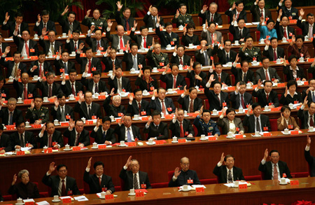 Delegates raise their hands to cast votes for a resolution on the Central Commission for Discipline Inspection's work report at the Great Hall of the People in Beijing October 21, 2007. The conference elected a new central leadership for the Party and endorsed a political declaration to chart the country's development. [newsphoto]