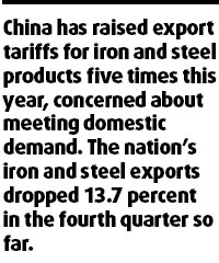 China has raised export tariffs for iron and steel products five times this year, concerned about meeting domestic demand. The nation's iron and steel exports dropped 13.7 percent in the fourth quarter so far. The average CIF (cost, insurance, freight) to China from January to September hit $79.72 - 27.06 percent higher than the corresponding period of last year, the CISA said. The spot contract freight cost from Brazil to China has exceeded $90 per ton since November. "The recent rise in marine transport costs is unusual and unreasonable," said Luo. "It has gone beyond an acceptable level." Speculation on the soaring price of iron ore intensified as Melbourne-based BHP Billiton Ltd, the world's second-largest mining resource giant, raised a $128 billion bid earlier last month to take over London-based Rio Tinto. The combined company, if the deal goes through, would draw level with rival Brazil Cia Vale do Rio Doce, and would take up nearly 40 percent of the global iron ore export market. "It may further drive up the price, as the two companies will have greater bargaining power after the merger," said Chen Xianwen, CISA's deputy director of market research.