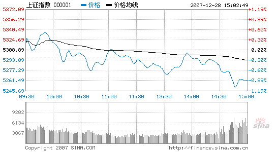 Updated: 2007-12-28 17:18 Although the year's last trading day failed to surprise investors as the major stock index closed 47 points lower, it concluded a year of wonder for China's capital market and left hopes high as 2008 approaches. Affected by the drop of Asian markets in morning trade, the benchmark Shanghai Composite Index retreated to below 5,300 points after briefly touching the week's highest of 5,336.5 points in the morning session. It lost even more ground in the last half-hour as investors were reluctant to participate given no signs of an index recovery on the last trading day of the year. The index ended at 5,261.56 points, 0.89 percent lower than Thursday's close. Shanghai Component Index ![]() The Shenzhen Component Index also lost 96 points and closed at 17,700.62 points. Combined turnover of the two markets reached 196.14 billion yuan , a bit lower than the previous day. Of all the stocks traded today, 496 gained, but as many as 1,027 stocks closed even or lower. Drowsy performance of large cap blue chips served as the major reason behind the index's loss today, although some investors had hoped fund managers could raise them a little for a prettier year result. Industrial and Commercial Bank of China drop 0.08 yuan to 8.13 yuan. Heavy-weighed PetroChina lost 1.37 percent and close the year's trading at 30.96 yuan, still 17.64 yuan lower than its spectacular November 5 opening of 48.60 yuan. In contrast, Quan Jude Group, a famous catering firm, snatched the fifth limit up in the past six trading days and closed at 59.03 yuan despite the company denied any significant plans that could greatly influence its stock price in an announcement to the bourse. |