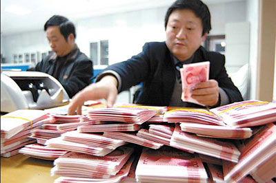 A bank worker counts money at a China Construction Bank branch in Hai'an, Jiangsu. Money supply growth slowed in February, due to the government's monetary tightening policies.[China Daily]