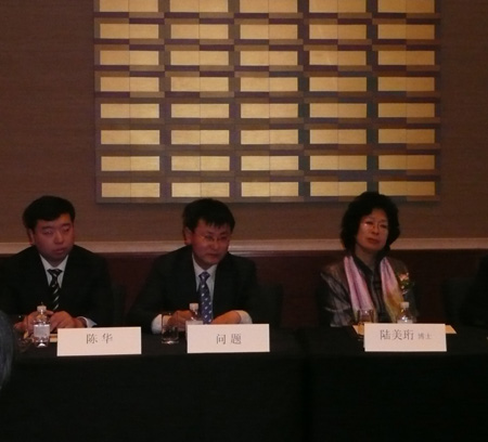 (From left to right) Chen Hua, executive director for advertising and sales for CCTV.com, Wen Ti, vice general manager of CCTV.com and Dr. Priscilla M. Lu, chairman and chief executive officer of ViDeOnline, speak at the joint press conference on March 28. ViDeOnline was granted exclusive adverting rights by CCTV.com for the Olympics. [chinadaily.com.cn]