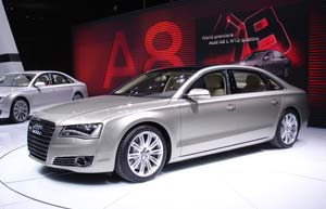 An Audi A8L Hybrid is displayed at Auto China 2010 in Beijing.