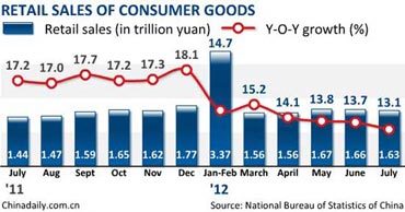 China's retail sales grew 13.1 percent year-on-year in July, slightly down from 13.7 percent in June, the National Bureau of Statistics said.