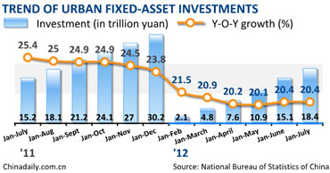 China's urban fixed asset investment rose 20.4 percent year-on-year to 18.43 trillion yuan ($2.93 trillion) in the first seven months of 2012.