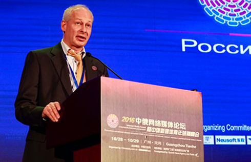 Alexey Volin, deputy minister of Telecom and Mass Communications of the Russian Federation, delivers a speech on Oct 29, 2016 during the China-Russia Internet Media Forum & China-Russia New Media Youth Leadership Summit being held in Tianhe, Guangzhou city. [Photo by Zhu Xingxin/chinadaily.com.cn] |