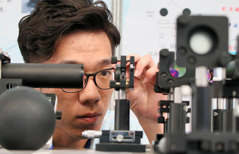 A student from Shandong University, Weihai, adjusts a "Gravitational Wave Simulation and Detection Experiment System" at the 15th Challenge Cup Shandong province's University Students Extracurricular Academic Technology Competition in Yantai, East China's Shandong province, on May 21, 2017. The competition attracted 206 teams from 59 universities who brought projects covering 10 areas such as mechanical control, life sciences, energy and chemical industry and social management. [Photo/VCG]