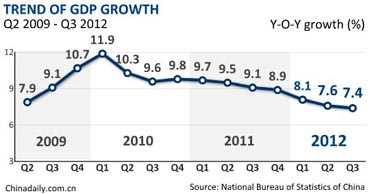 China's economy expanded 7.4 percent year-on-year in the third quarter of 2012, slowing from 7.6 percent in the second quarter and 8.1 percent in the first.