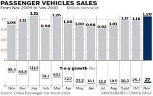 More than 1,280,000 cars, multi-purpose vehicles, sports-utility vehicles and minivans were sold in November, up 27 percent from a year earlier and 10.5 percent from October, said the China Passenger Car Association on Tuesday.