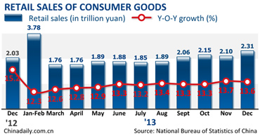 China's total retail sales in 2013 increased 13.1 percent year-on-year to 23.44 trillion yuan ($3.87 trillion), the National Bureau of Statistics said on Monday.