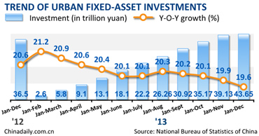The annual growth of China's urban fixed-asset investment cooled to 19.6 percent in 2013, the National Bureau of Statistics (NBS) announced on Monday.